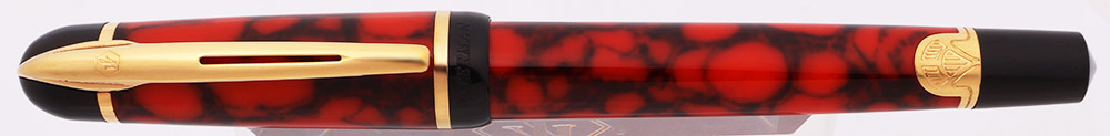 Condition Excellent condition with no cracks, chips, dents, or dings. This is a beautifully colored, shiny pen that looks great. The cap, barrel and black end piece of the barrel have light to moderate scratching. The gold trim and clip have light microscratching. The clip ring has more moderate microscratching and many miniscule dots of plating wear. The top black piece on the cap has a few small scratches. The imprints are clear.