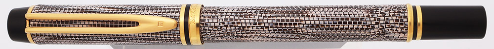 Condition Excellent + condition with no cracks, chips, dents, or dings. This is a nice-sized, uniquely patterned pen in a pleasing color design. The cap and barrel look great. There is some light scratching on both that is very difficult to see due to the pattern. There are miniscule dots on the surface of the cap and barrel that we believe are part of the pattern and not surface wear or scratches. The gold plated trim, clip, and cap band have light microscratching. The imprints are clear.