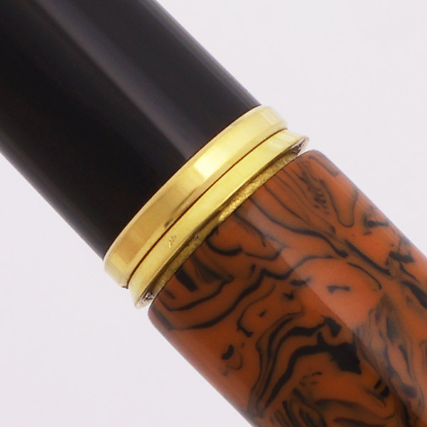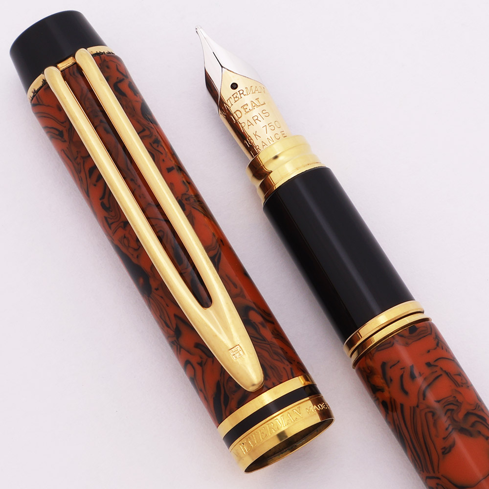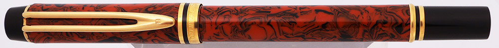Color "Red Ripple" - a deep, warm orange color marbled with black. Completely unlike the original Waterman hard rubber red ripple! Black end pieces, gold trim.