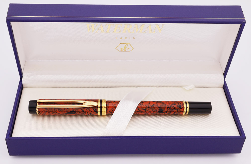 Condition Excellent condition. This is a shiny pen with a beautiful marbled pattern. The pen has light wear with some scratches. There are polishing marks on the cap band and clip. The trim ring at the front of the section looks great. There is a tiny gap between the section and barrel, probably the result of material shrinkage, and we've included a closeup of this area in the photos. The imprints are clear. Ships in Waterman box with an outer protective cardboard sleeve. There is a booklet underneath the platform in the box.