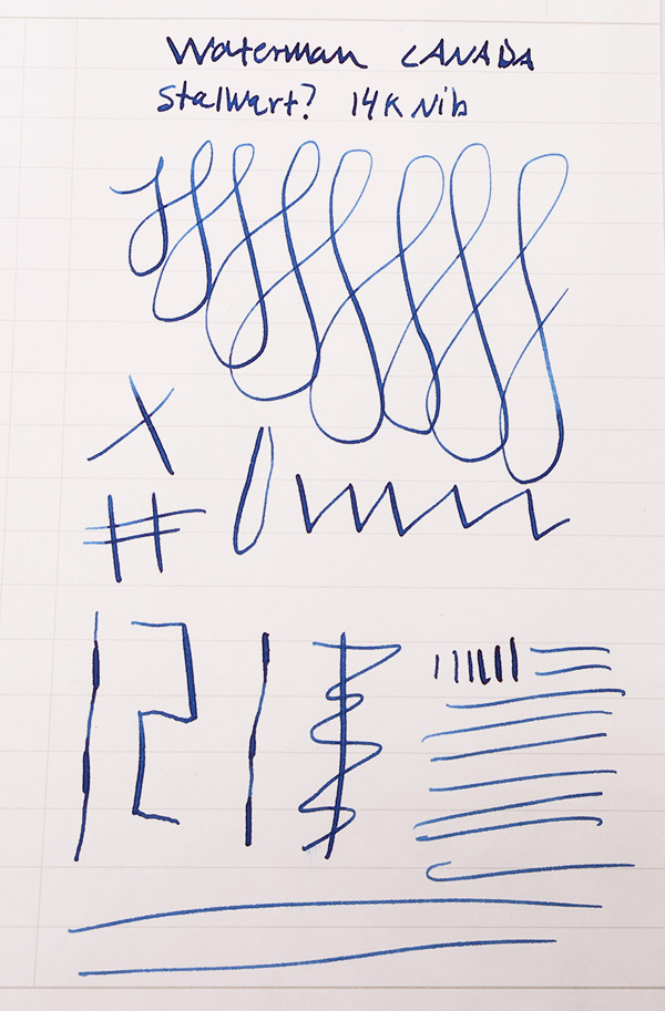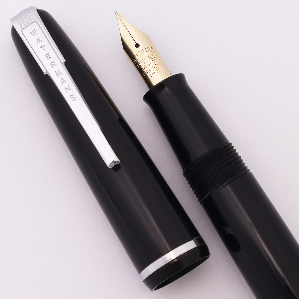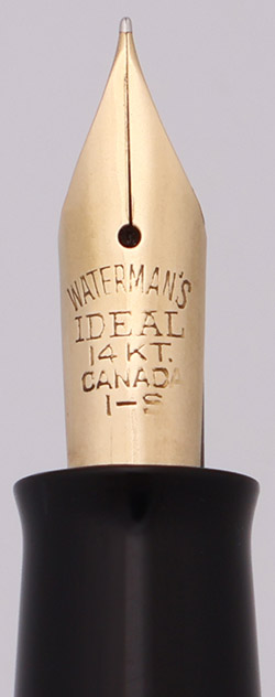 Nib 14k nib is marked "Watermans IDEAL 14-KT Canada" and is fine and nicely flexible. If you are looking for flex that is easy to write with on an every day basis, these 1940s Watermans can't be beat in terms of flex-per-dollar. Flexes up to broad (see writing sample below).
