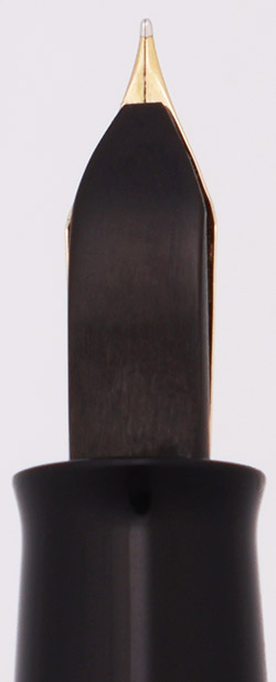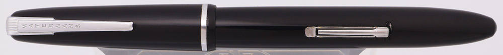 Condition Excellent + condition. The barrel and cap have microscratching, but no deep scratches. The clip has some microscratching, but no brassing or plating wear. The cap band has brassing along the upper and lower edges. The section has some visible glue residue. The barrel has small marks and microscratching, but no large individual scratches, or cracks or chips. The imprint is clear. The pen is working very well.