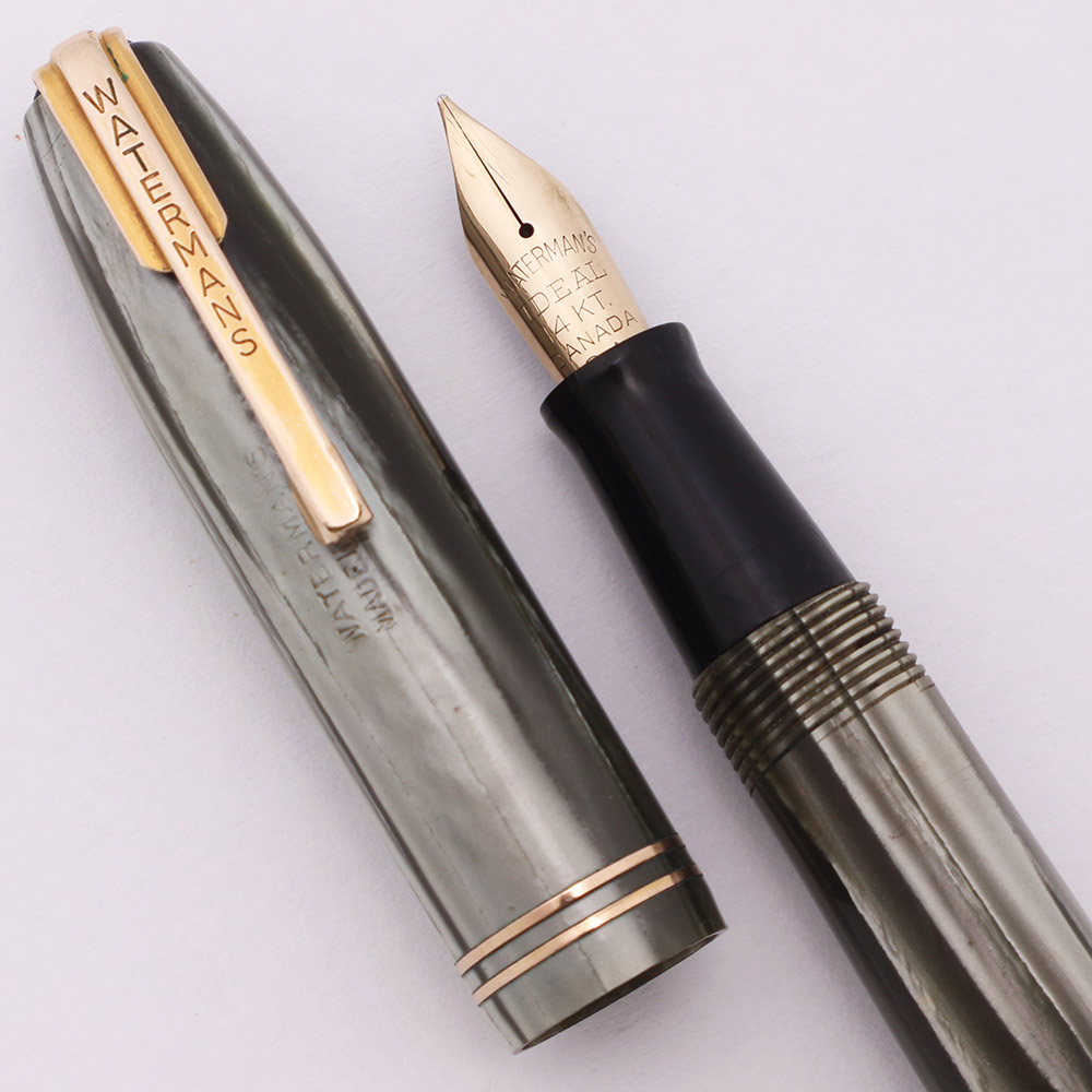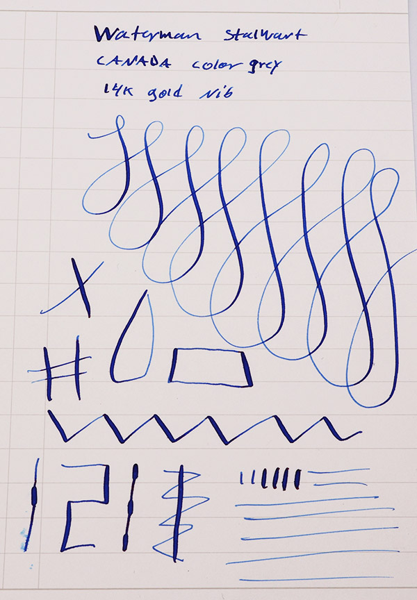 Nib 14k nib is marked "Watermans IDEAL 14k Canada 2A" and is fine and flexible in a daily-user way, not full flex. See writing sample below. There are some visible scratch marks on the upper surface of the nib, but these do not affect the writing performance.