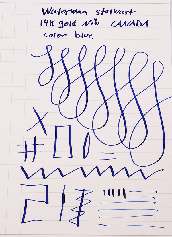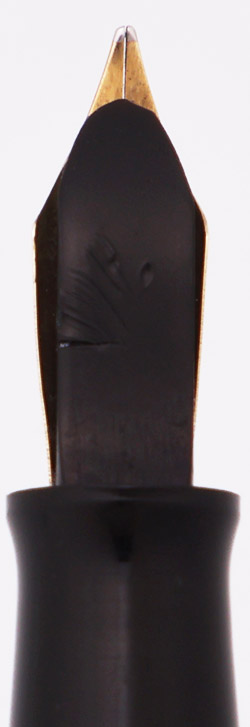 Nib 14k nib is marked "Watermans IDEAL 14k" and is fine and flexible in a daily-user way, not full flex. See writing sample below. There are some tool marks visible on the right side of the nib, as well as some scratching on the upper surface and a deep scratch on the feed, but these do not affect the writing performance.