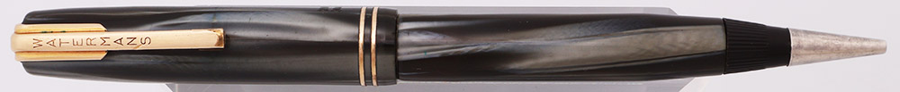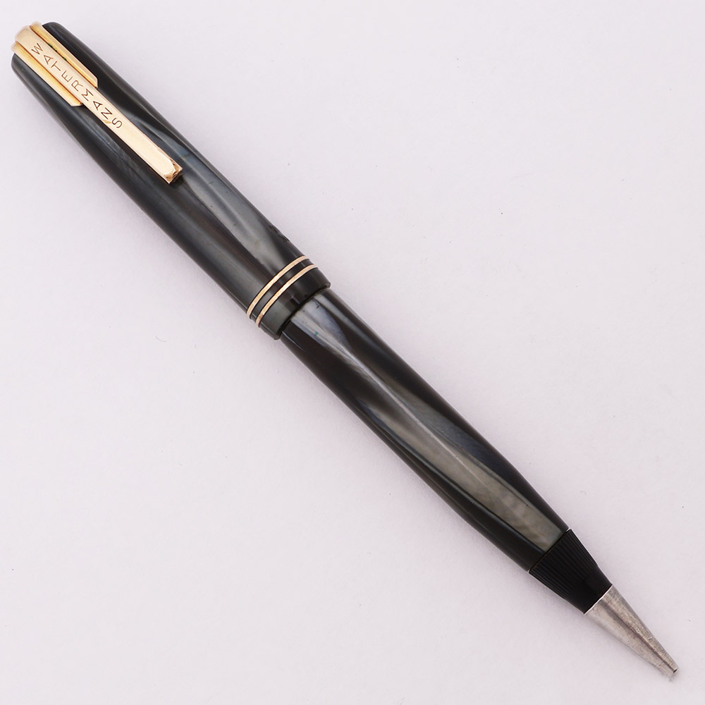 Condition Excellent condition with no cracks. This is a small, pretty pencil that works well. The barrel portion has light to moderate scratching. The cone has complete plating wear with a few small scratches. The double thin cap bands have brassing and have thin lines of pitting along some of the edges. The clip has one small, deep scratch near the "N". The top emblem on the cap has complete plating wear, or perhaps it was silver colored to begin with. The imprint is clear.