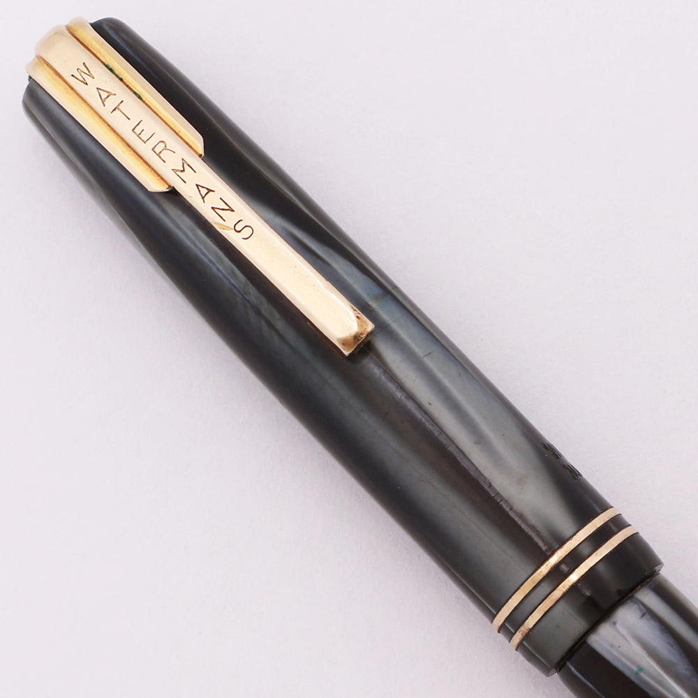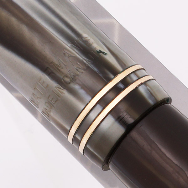 Color Grey with lengthwise striation in lighter and darker shades. Gold plated trim. Thin double cap bands.