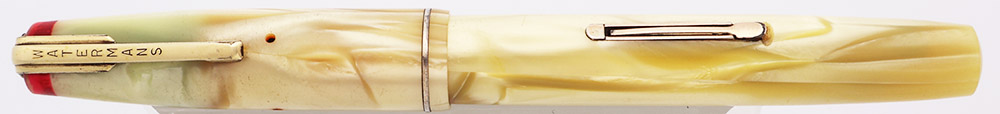 Color Ivory marbled with a small painted red band around the very top of the cap. Gold plated trim with a single thin cap band. The color has yellowed slightly, but still looks great.