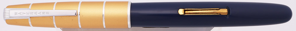 Color Blue with a satin gold-colored cap with widely spaced grooved rings. Trim is chrome colored.