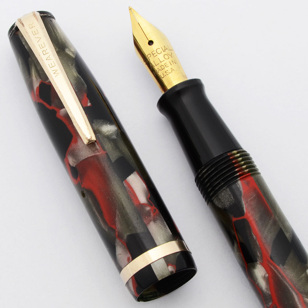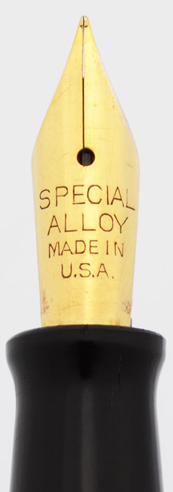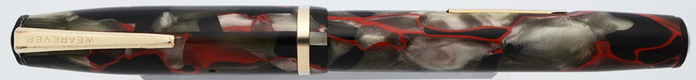 Condition Excellent condition. This is a nicely colored pen with good shiny. The section has a crack that goes from the feed to about 1/3 of the way down the section body. The barrel has marks caused by the cap lip and moderate scratching, with some small bite-type marks near the end. The black end piece has scratches along the edges. The cap has light to moderate scratching with a small deep mark and a small chip along the lip. The lever has microscratching. The cap band has one deep line scratch and some dots of pitting alongside that. The clip has some small scratches. The top jewel has a chip just above the clip. The imprints are clear.