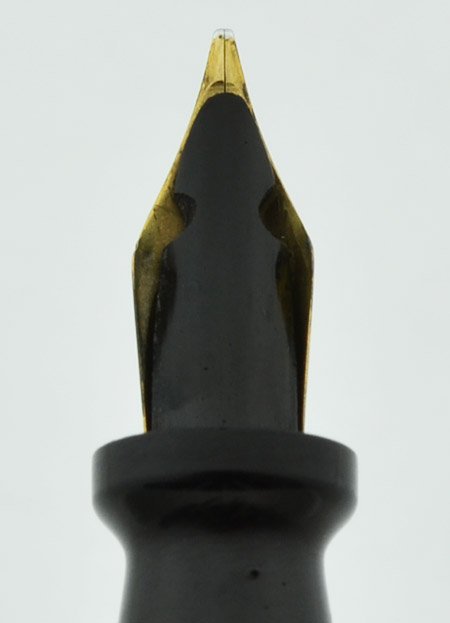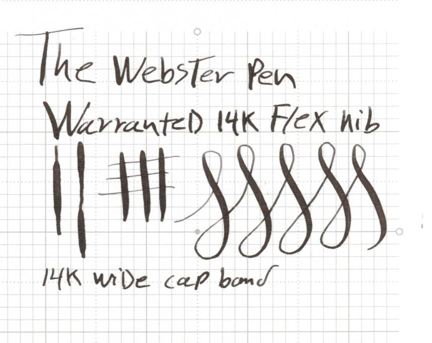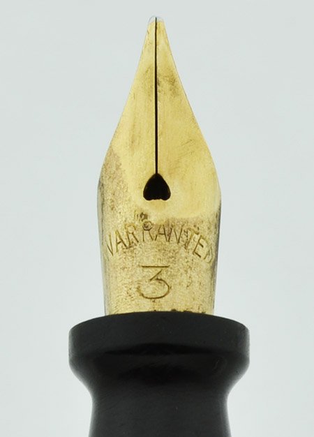 Nib FLEXIBLE MEDIUM gold Warranted #3 nib is smooth with excellent tipping material. It's close to what we would call full flex, with variation from a small medium to a double broad under very little pressure. There's some staining/patina on the top of the nib that resisted the first pass of Simichrome, but it can probably be improved with a little more polishing. See writing sample below.