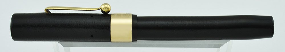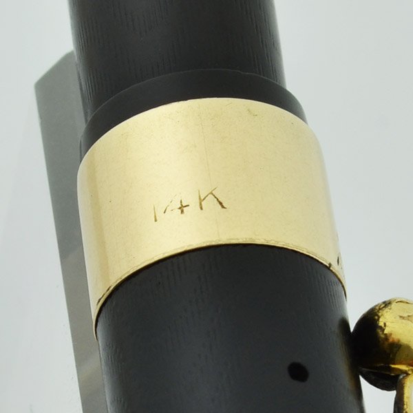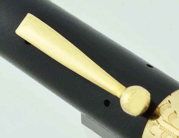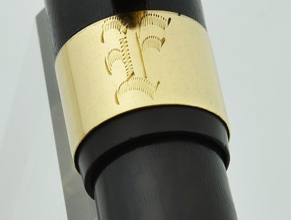 Color Black chased hard rubber with gold plated trim and a solid 14k gold cap band.