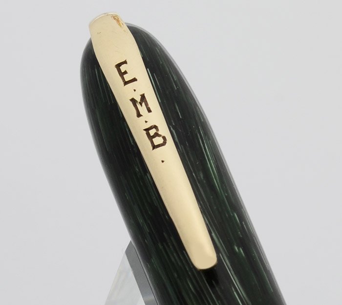 Condition Excellent condition with handwear and a bit of plating wear on the cap band. The patterning is great and there are no dents, chips, cracks, or bite marks. The clip has been personalized, "E.M.B." The pen is fully restored and working very well.