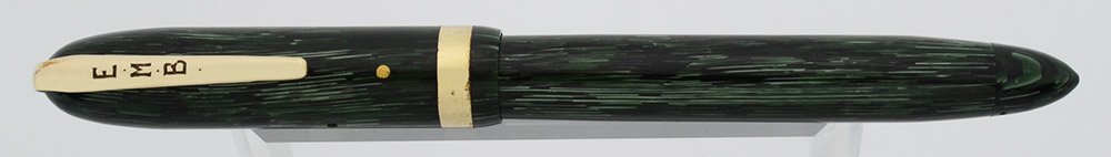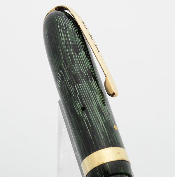 Color Striated green celluloid. This pen is reminiscent of a Sheaffer with military clip, while the striated pattern resembles the Parker "shadow wave" design. It It has a dot on the cap and a military-style clip. The stripes are almost like paint strokes.