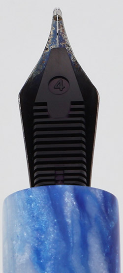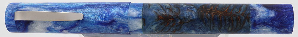 Color Swirly blue and white glittery material, with a strip of a slightly different material around the barrel. We're not quite sure what it is, but it looks kind of like maybe some wood impregnated in resin to us.