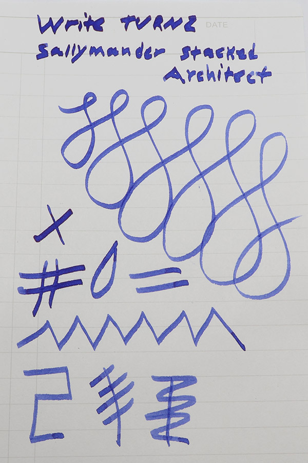 Nib Very interesting stacked architect nib by someone named "Sallymander" (Instagram link). The lower layer seems to have been given some sort of heat treatment. This would be a great nib for ink swatching, because it'll put down a lot of ink. Check out our writing sample in the photos.