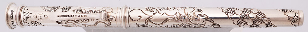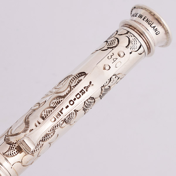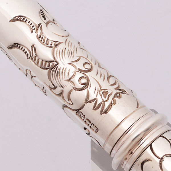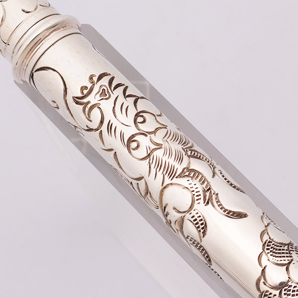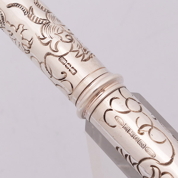 Condition Excellent + condition. Very light handwear with a few marks here and there. There are some scattered marks on both the cap and barrel, which appear more like artifacts of hand-engraving the pattern. The hallmarks aren't all crisp but that's the nature of work done by hand; they are clear and readable. No dings, dents, or personalization.