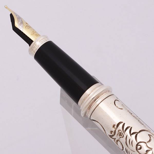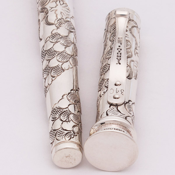 Color Sterling silver with a long hand-carved dragon wrapped around the cap and barrel. It has a smooth black plastic section. The general shape is modeled after the old pencils that made the brand well known.